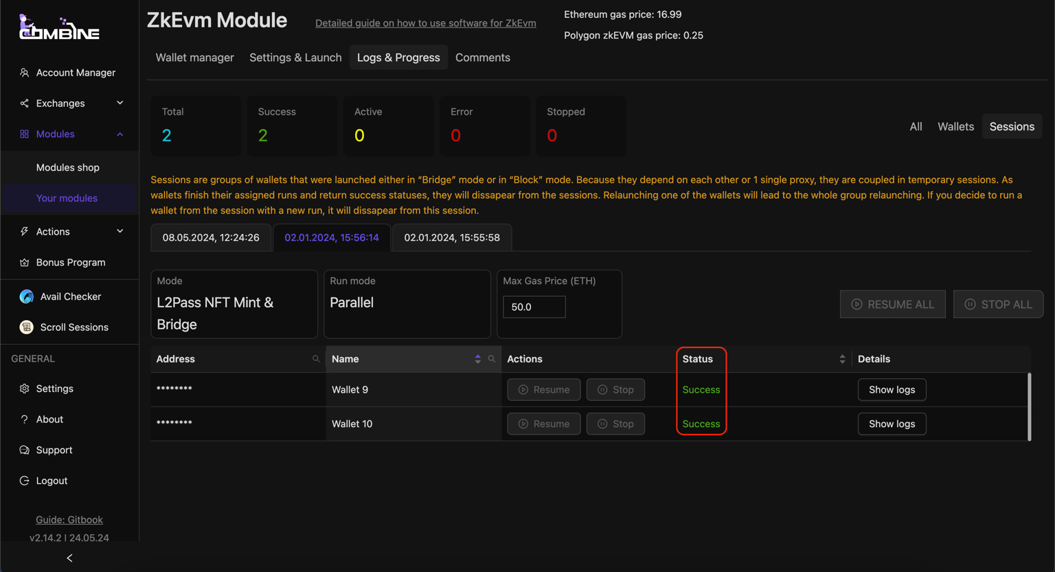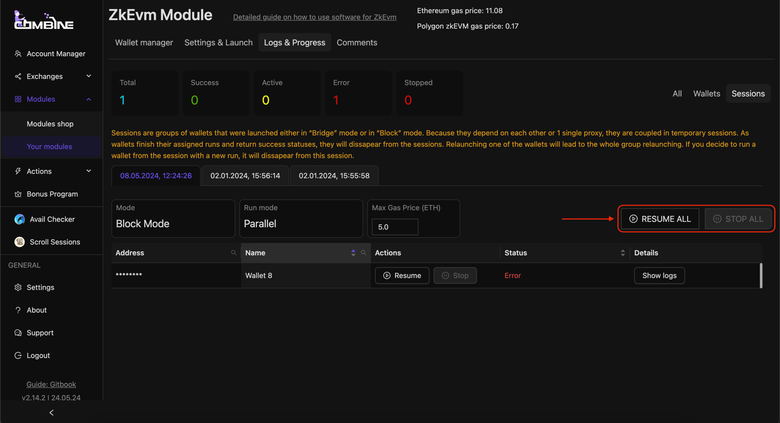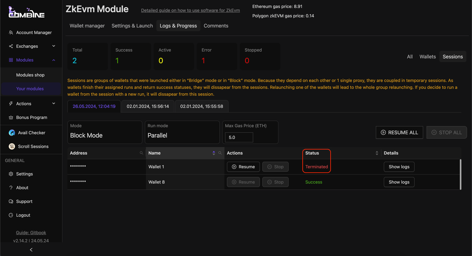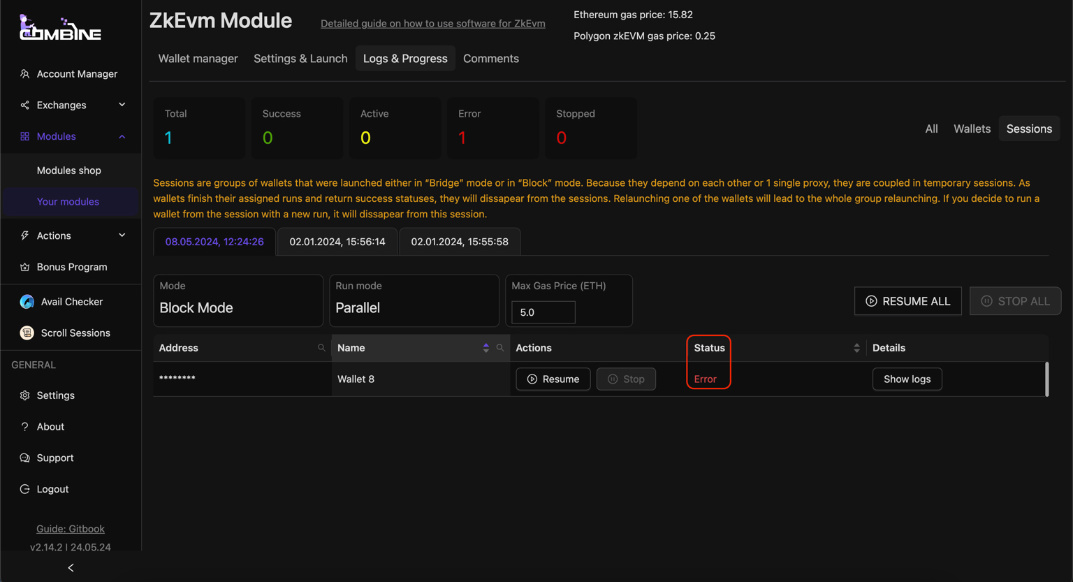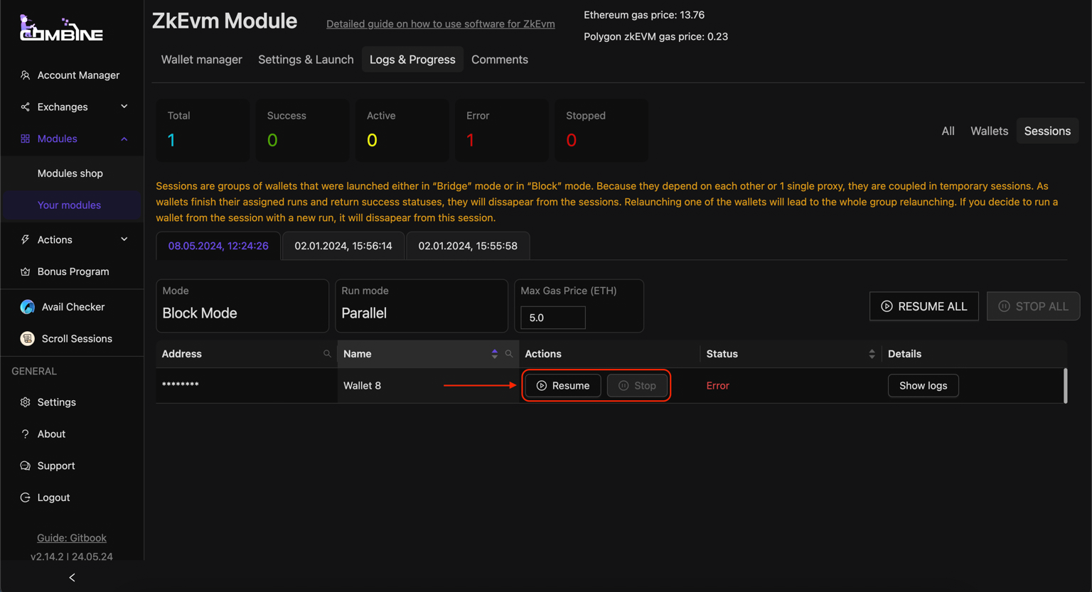 * If the **Status** field shows an **Error**, you can check the logs to find out why the software was interrupted. If the error was due to insufficient balance or another user-dependent reason, you can fix it, then click **Resume**, and the software will continue the session from where the error occurred for that wallet.