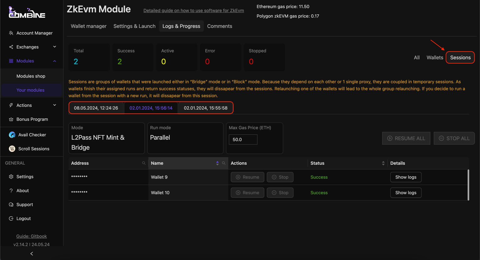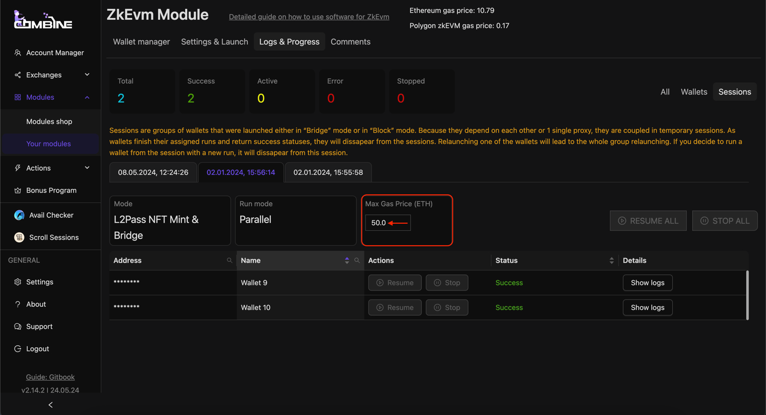 If you want to pause the sessions, click **Stop All**. To resume the wallets' operation, click **Resume All**, and the software will continue its work from where it left off, generating new delays between the wallets.