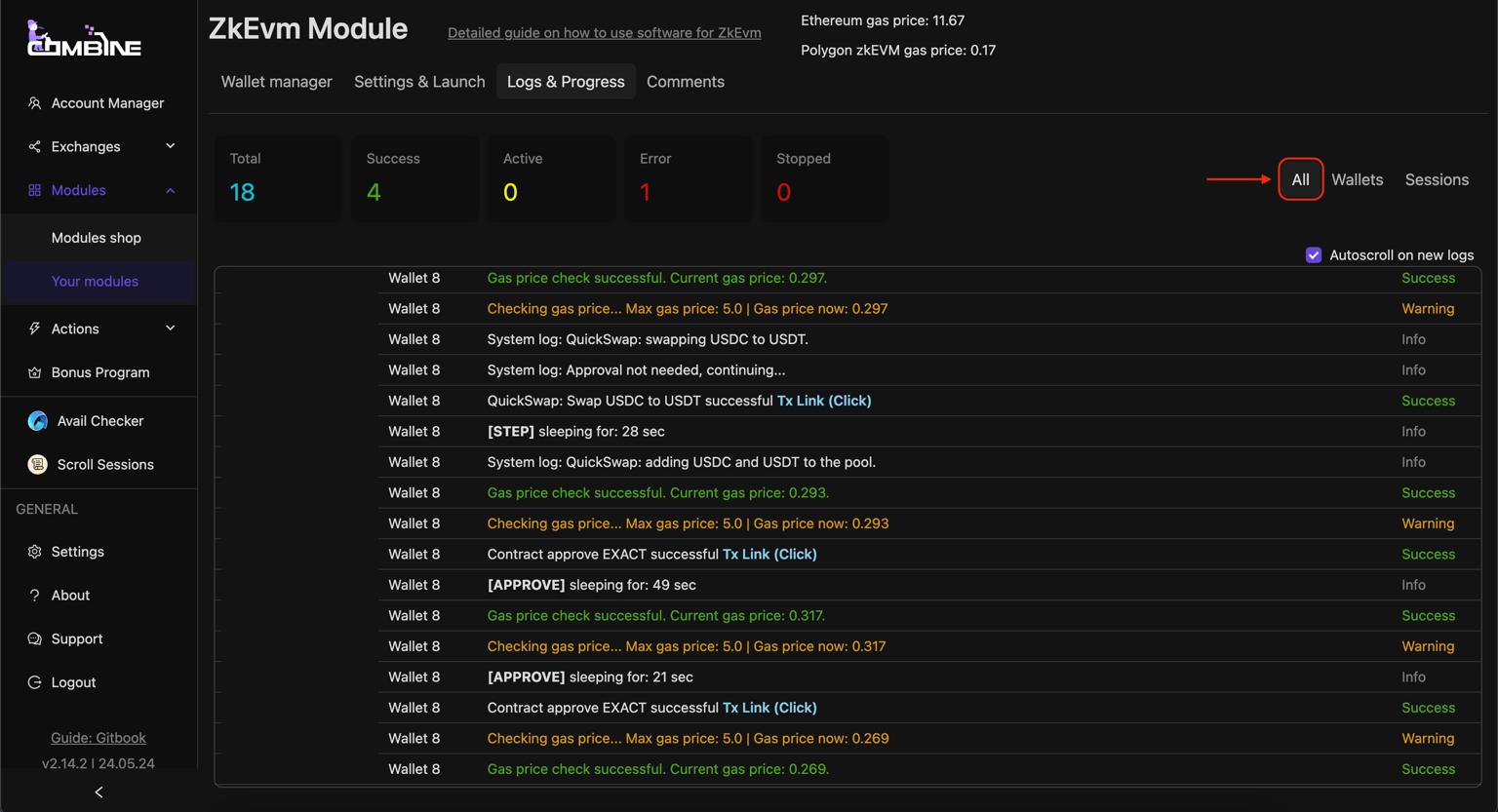 * After you have launched a session with the selected parameters in the Setup and Launch section, you will be automatically redirected to the **Logs & Progress** page, where you can see all the actions taken by the software for each specific wallet;