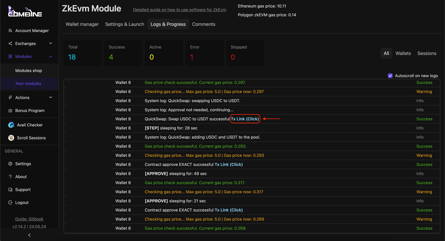 In the Logs & Progress section, you can view logs and the transaction history of your wallets, see where and at what specific time a transaction was made, and review any errors if they occurred. This section also allows you to find your transaction hashes, pause wallets, or resume their operation.