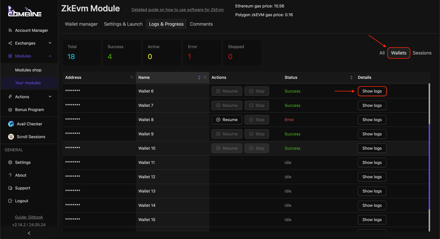 * In the **Wallets** section, you can view the logs for each wallet individually by clicking the **Show logs** button next to it.